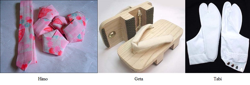 Kimono ve obiyi giydik, dışarıya tabii ki yalınayak çıkmayacağız. Japonlar kimono ve obinin altına “geta” denen, genellikle tahtadan yapılan takunyalar giyerler. Erkeklerin getaları dikdörtgen, bayan getaları ise oval olur. Hava koşullarına, mesleğe, yaşa ve kişisel tercihlere göre çeşit çeşit geta vardır. Geta ile giyilecek olan çoraplara ise “tabi” denir. Genellikle beyaz olurlar. Resmi kıyafetler ile kesinlikle tabi kullanılır.